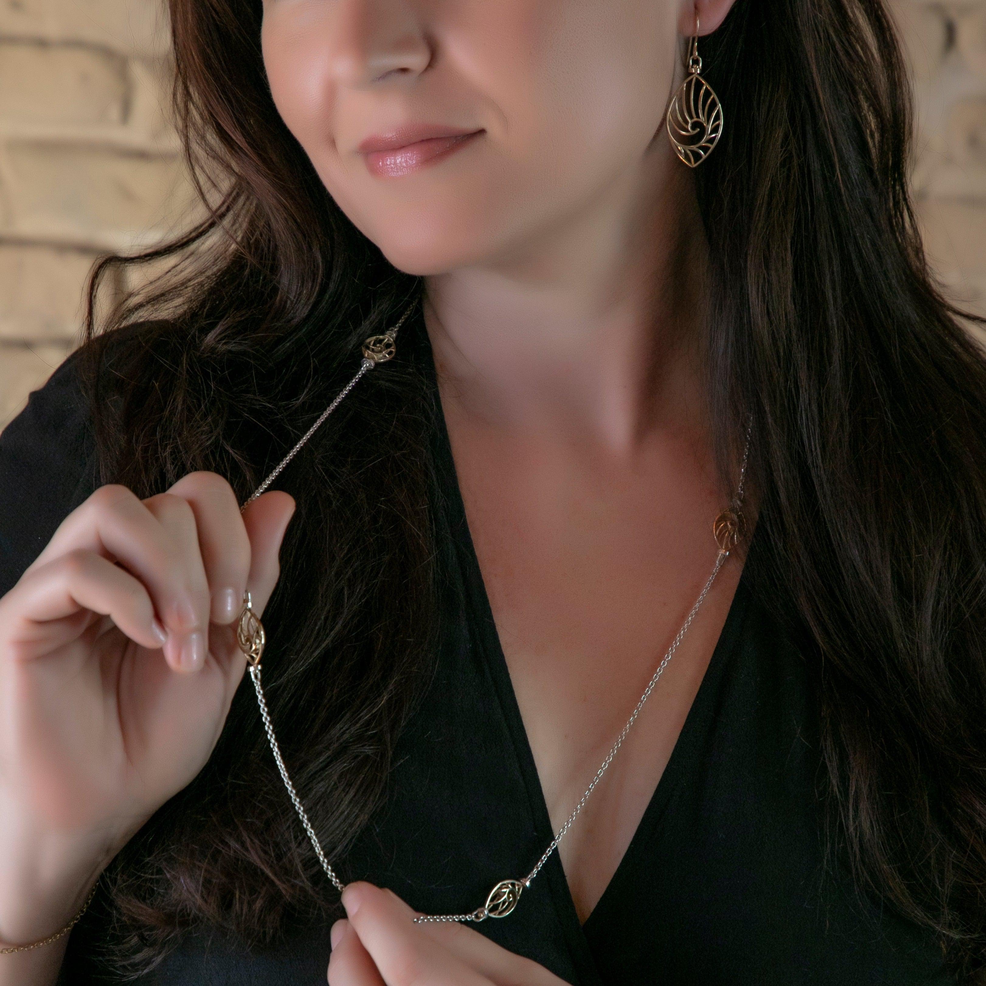Just like all of the other pieces in this collection; every piece is a Fibonacci number, this chain is 34 inches long and has 5 Eternal Joy charms