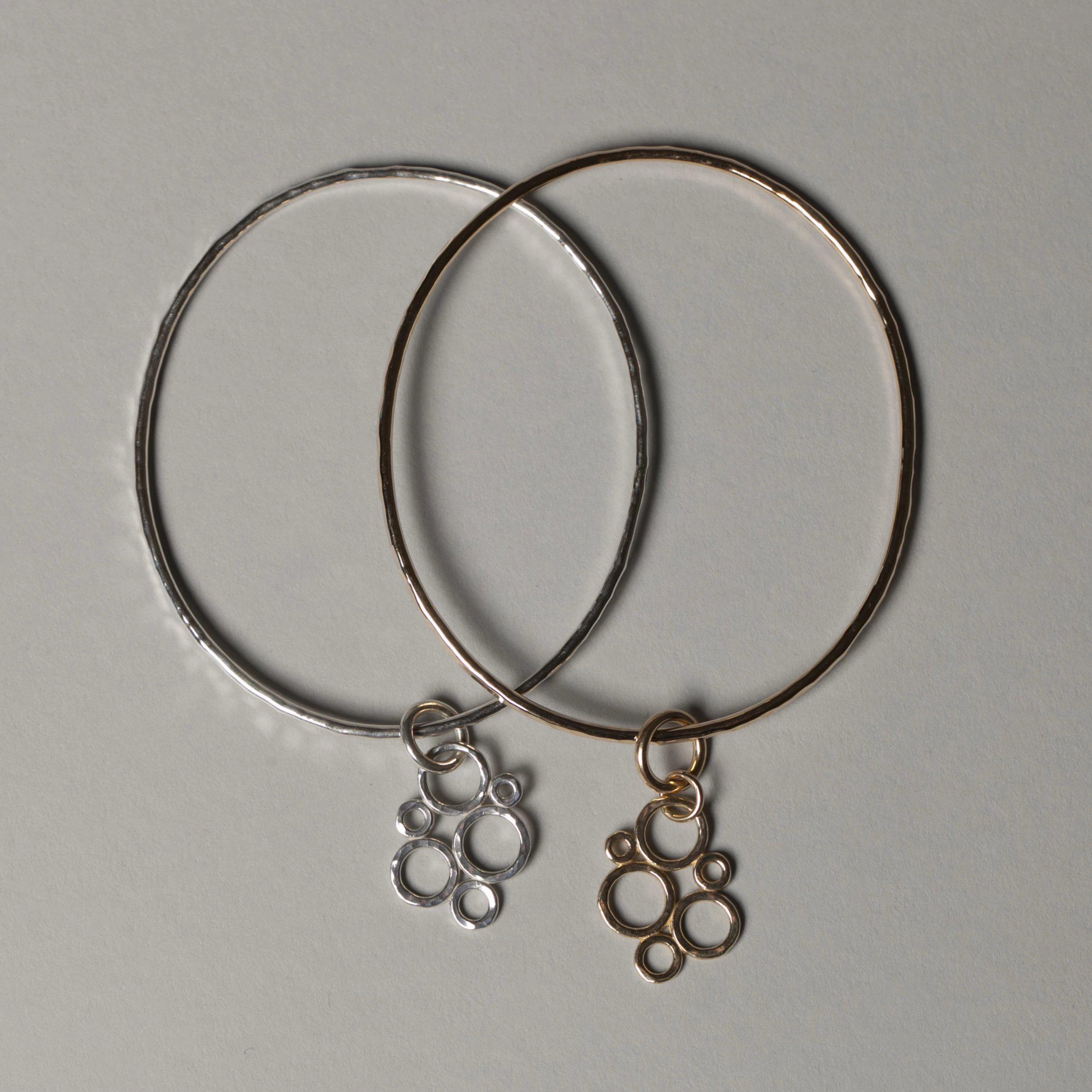 Your Champagne Charm is available in Sterling Silver or 14K Gold. The charm is 3/4 inch or 2 cm long and 6/8 inch or 17 mm wide. Charms can be worn on bangles (as pictured) and with charm necklaces.
