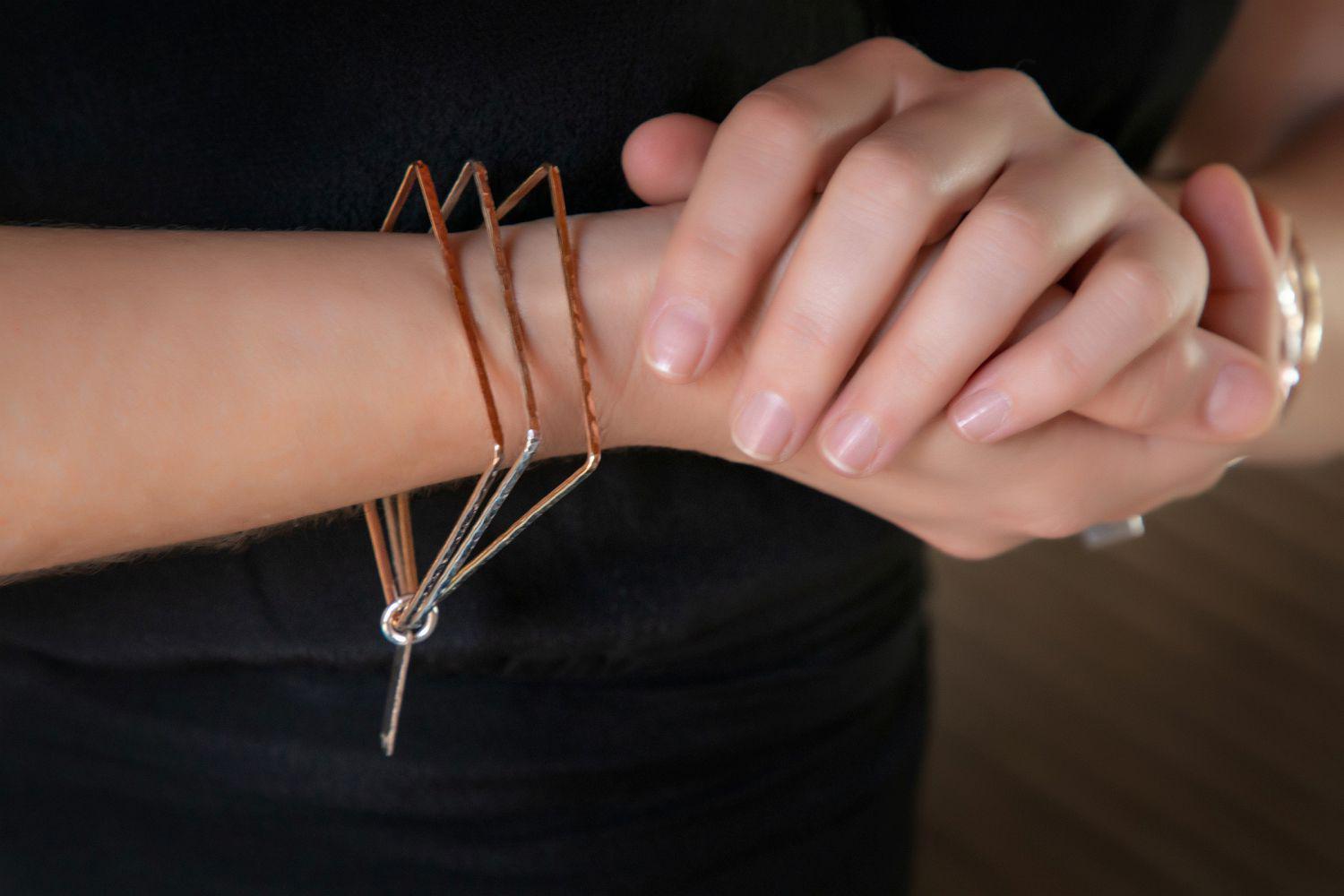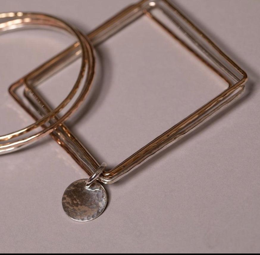 Your handcrafted Triple Bangle Bracelet with Charm is offered in your choice of square or oval bangles with- one Sterling Silver bangle, one Rose Gold-Filled, and one Yellow Gold-Filled accompanied by a circle or rectangular charm, available in Sterling Silver. The elegant, natural look of the hand-hammered finish catches and reflects light beautifully. Your charm piece can be personalized and custom engraved with a name, date, or inspirational word (9-12 characters).