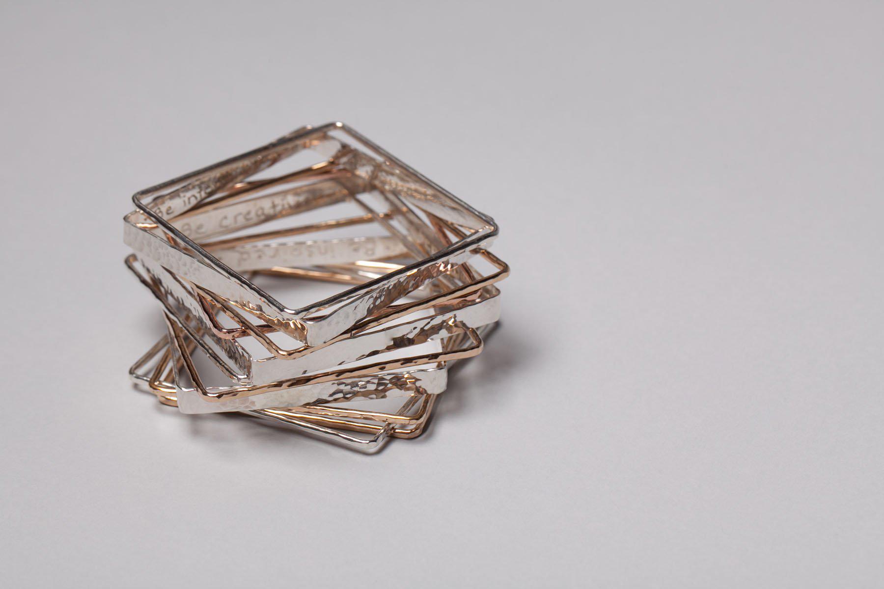 With everything we do, from hammering metal to marketing, we want to feel "inspired, creative, and intentional". We want you to feel those same intentions when you wear them. You can find these words hand engraved on the inside of the bangle plus there is a little space for me to engrave something meaningful for you.